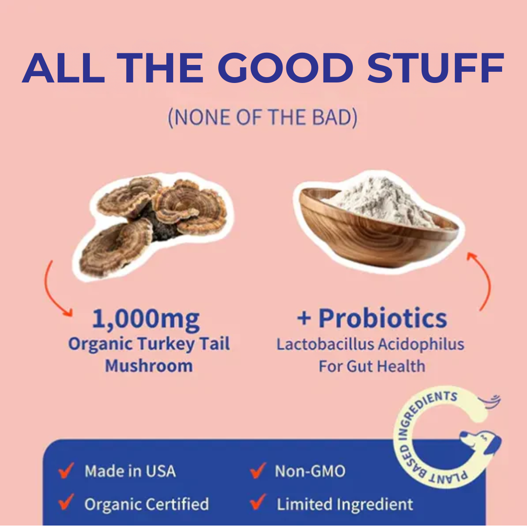 Only formula combining Turkey Tail + probiotics to support the 70% of immune system in the gut.